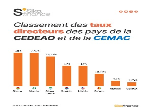 Le taux directeur est de 28 % au Ghana, 27,5 % au Nigeria, 24 % en Sierra-Leone. La Gambie et le Liberia font un peu mieux à 17 % pendant que la Guinée est à 10 %. Dans l’espace Cemac, le taux directeur est à 4,5 % contre 3,25 % pour l’espace Uémoa.
